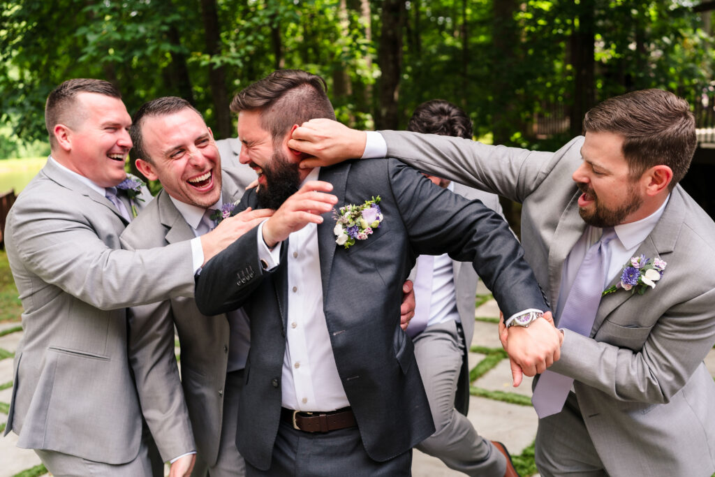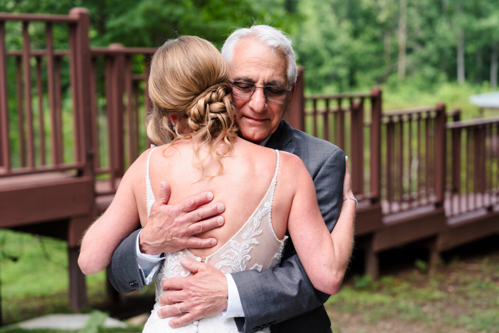 Now, if there is one thing we’ve learned as wedding photographers, it’s that you can’t plan for a downpour, but you can plan to have the absolute best time anyway. When we arrived at The Barn at Valhalla for Taylor and Michael’s wedding, it was a hot and sunny June day and everyone was staying inside in the air conditioning getting ready (or playing pool in the case of the groomsmen). Taylor was nervous but also super excited. At one point, she even snuck down the basement to get a much needed hug from Michael. I just cannot with the cuteness of these two! The little moments during the morning quickly evolved to some big emotional moments when Taylor shared a first look first with Michael and then with each of her dads. But don’t worry, their rambunctious wedding party swooped in to break the tension before the ceremony.