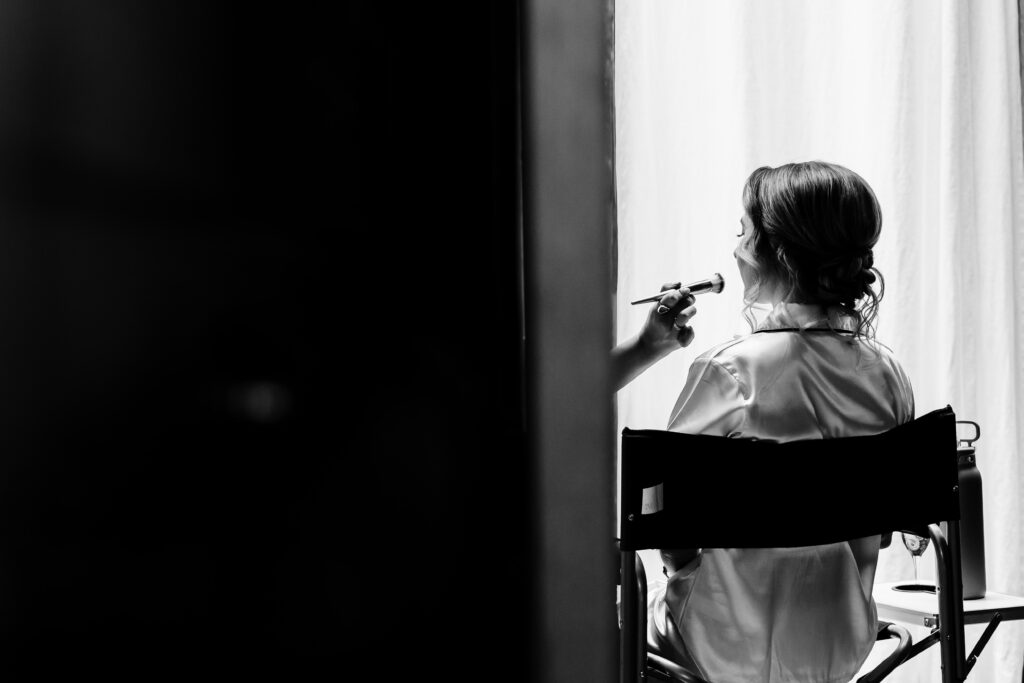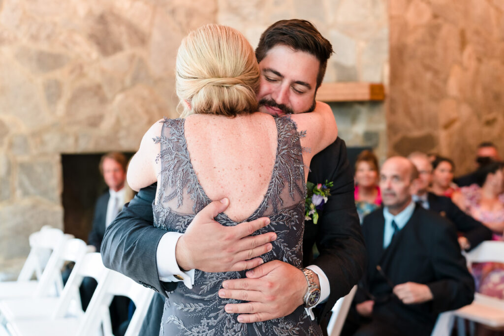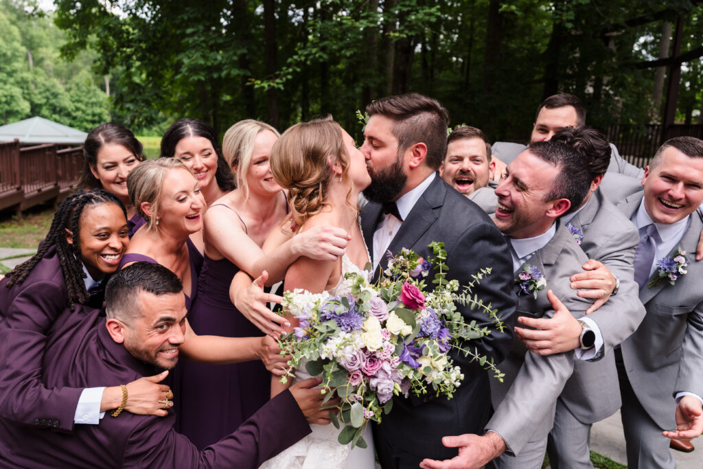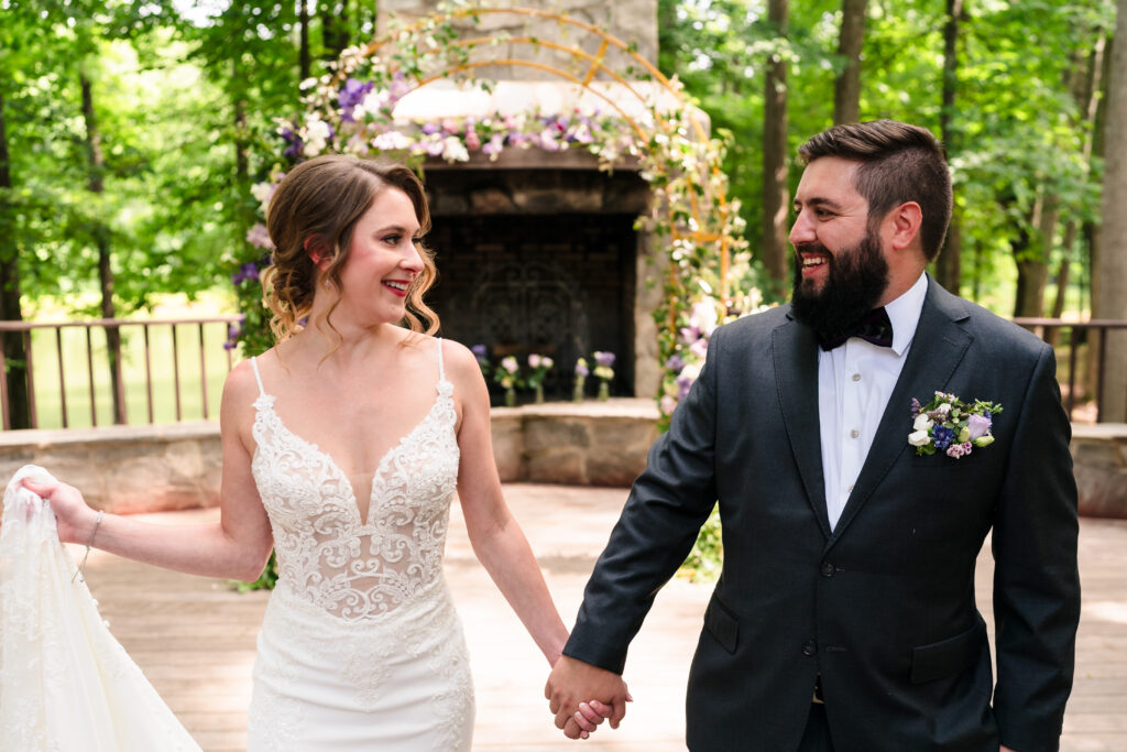 The original plan for this Barn at Valhalla wedding was a dreamy ceremony in the woods, centered around the iconic outdoor stone fireplace. However, Mother Nature had other ideas. The almost daily (and quite inconvenient) late afternoon summer North Carolina downpour forced a last-minute audible. While some couples might have stressed, Taylor (the energetic ball of love) and Michael (the cool, easy-going one who definitely thinks he’s funny) didn’t miss a beat. They moved the ceremony inside The Lodge. The result? An incredibly intimate, floor-to-ceiling wood-walled ceremony that felt like a giant, warm hug. With the rain drumming on the roof and the massive chandeliers glowing, Taylor and Michael exchanged vows in a space that felt perfectly “them.” Ironically, the rain stopped as soon as the ceremony was over and we got outside to take some killer sunset photos!